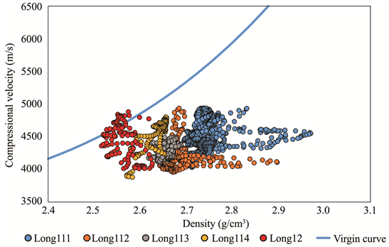 A pore pressure prediction method considering the overpressure mechanism is pro-posed by Bowers [18]. It is necessary to determine the formation mechanism of abnormal high pressure in the Longmaxi formation in Luzhou block. Use the normally compacted mudstone data to establish a normal trend line of the relationship between compressional velocity and density, this can be expressed by the following equation: