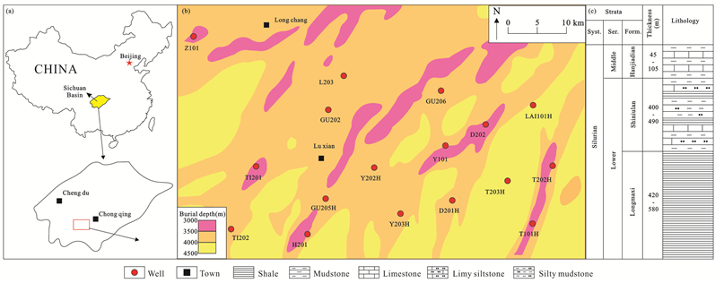 Figure 1. Geographic location and lithological column of study area. (a) Location of Sichuan basin; (b) Location of the study area; (c) Lithological column of the Silurian formation.