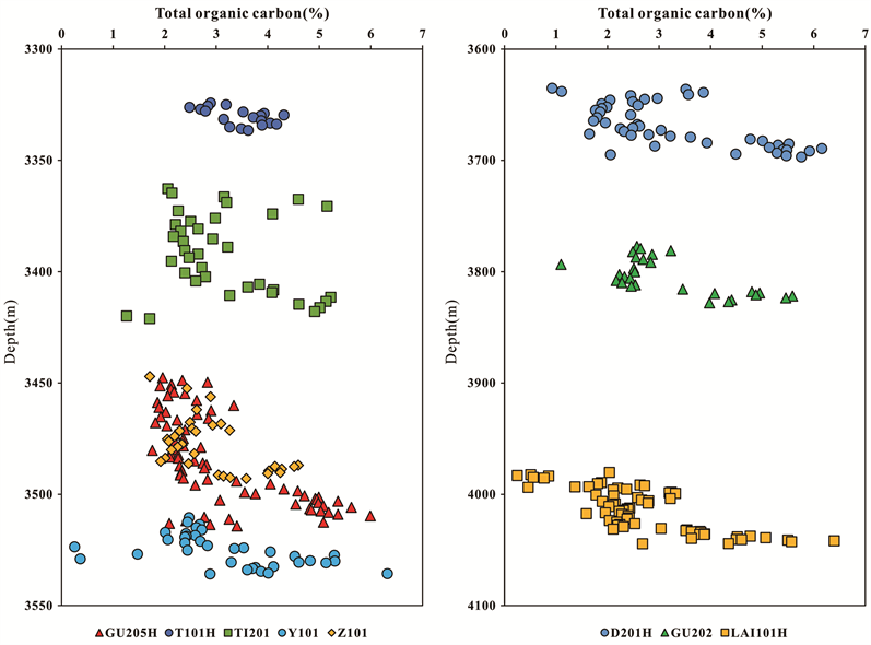 Figure 4. Correlations between depth and total organic carbon.