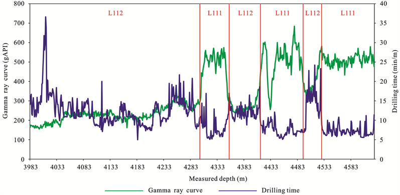 The drillability level of each layer of the Long11 sub-member is about 4 - 6, and the abrasiveness is 2 - 4, belonging to the medium-soft stratum, as shown in Figure 6. According to the drill data of 7 horizontal wells that have been drilled in the Luzhou block, when drilling in different layers of the Long11 sub-member with the same drilling parameters and drilling assembly, the ROP (rate of penetrating) is quite different. The ROP of the Long114 and Long113 layers can reach 7 - 8 m/h, The Long112 layer presents the characteristics of low gamma and high drilling time, The ROP is about 5.3 m/h, on the contrary, the Long111 layer shows the characteristics of high gamma and low drilling time, The ROP is about 6.5 m/h, as shown in Figure 7.