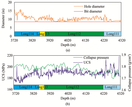 Figure 8. Wellbore stability parameter of different layers. (a) Correlations between depth and diameter; (b) Correlations between depth and UCS/collapse pressure.