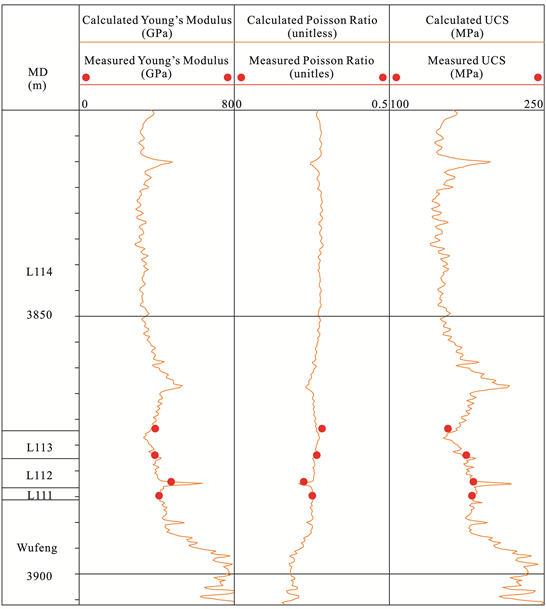The average Young’s modulus of the Long11 sub-member is 38.87 GPa. The Young’s modulus of shale from Long114 to Long111 layer are ranging from 25.4 GPa to 44.69 GPa (averaging 35.24 GPa), from 30.47 GPa to 40.53 GPa (averaging 35.23 GPa), from 31.02 GPa to 47.84 GPa (averaging 40.05 GPa), and from 26.45 GPa to 68.16 GPa (averaging 47.07 GPa), respectively.