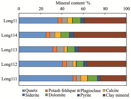 Figure 10 shows the X-ray diffraction analysis result, it indicated that the shale mineral composition of the Long11 sub-member in the Luzhou block are mainly clay minerals, quartz, dolomite, plagioclase, and calcite. The clay mineral content is the highest, with an average of 39.04%. And the content of quartz, calcite, and dolomite are 36.35%, 4.52%, and 7.47%, respectively. There is a certain difference in the mineral composition of Long114 to Long111 sublayer, the content of clay minerals gradually decreases, and the content of quartz gradually increases from shallow to deep.
