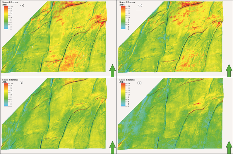 Figure 11. Depth slice of stress difference (a) Long111 formation; (b) Long112 formation; (c) Long113 formation; (d) Long114 formation.