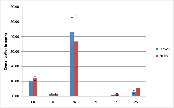 The average concentrations of copper, chromium and lead are higher in the fruits than in the leaves, whereas that of zinc is higher in the leaves than in the fruits (Figure 1). So this study shows a strong accumulation of zinc in the leaves and strong accumulation of copper, nickel, chromium and lead in the fruits.