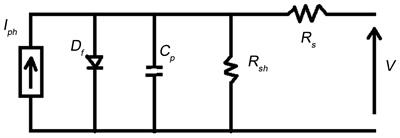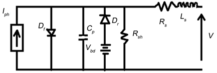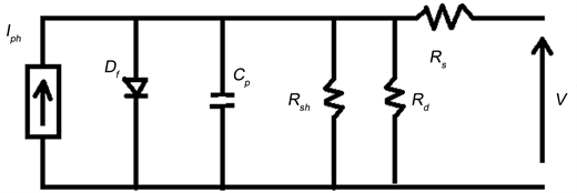 Very often, the single diode dynamic model is used for the dynamic study of solar cells. In some of the studies, only the forward-bias conducting diode Df, the parallel capacitance Cp (which is voltage dependant), the shunt resistance Rsh and the series resistance Rs are taken into account, as shown in Figure 3 [10] [11].