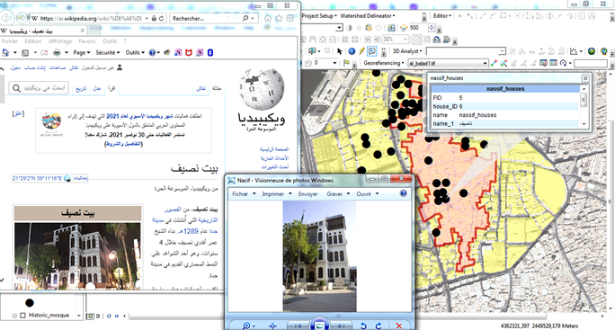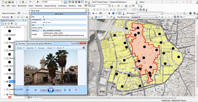 This research resulted in the creation of a geographical database for the historical area of Jeddah, as well as the collection of all the data required to produce it. It was made with the ArcGIS application, which allows us to exploit the base at the level of searching for information, disposing of it, and updating it as needed. The graphic below depicts a query on the displayed map that allows the user to obtain the stored data and view the descriptive information for all of the stored entities (Figure 8).