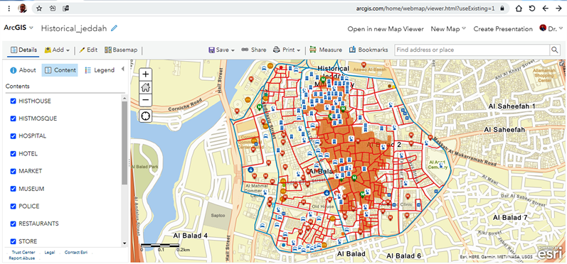 At this point, all of the data required to complete the geographical database had been obtained and rectified in accordance with what had previously been modeled. All spatial data relating to monuments, ancient sites, and modern sites that have a spatial dimension that can be calculated using the (X and Y) coordinates were collected. The data is divided into three types of phenomena. When features are depicted on maps, they are represented as homogeneous layers with three fundamental geometric shapes: point, line, and polygon. For all levels included in the database, the Mercator WGS84 system is used. Using ArcGIS software, the database was produced in File Geodatabase format. The information was gathered from many sources and was mostly reflected in reference data from the Municipality of Jeddah, survey and field inspection using satellite imagery, and the usage of references and prior research.