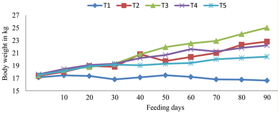 Figure 1. Body weight change over time of Washera sheep fed finger millet straw alone and supplemented with different proportion of grass pea hull and Concentrate mixture. T1 = FMS ad libitum (control); T2 = FMS ad libitum + 400 g CM; T3 = FMS ad libitum + 280 g CM + 120 g GPH; T4 = FMS ad libitum + 120 g CM + 280 g GPH; T5 = FMS ad libitum + 400 g GPH; CM = concentrate mixture (67% WB + 33% NSC); GPH = grass pea hull; FMS = finger millet straw.