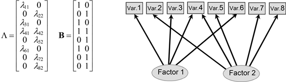 in other words, bij = 1 if variable i is linked to factor j; otherwise, bij = 0. In this sense, we call B a link matrix. Any CFA constraint can be expressed as