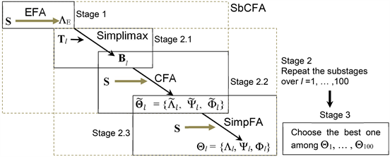. These three stages are described respectively in the following subsections. The last one can be regarded as confirmatory FA (CFA) on the basis of the B given by simplimax. We thus call the procedure in this section simplimax-based CFA (SbCFA).