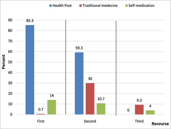 As the second-line, the use of the health post (HP) was higher (59.3%), followed by that of the traditional medicine (30%) and finally self-medication (10.7%).