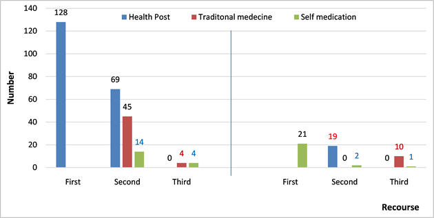 Among the 150 participants, 128 have used the health post as a first resort. As a second resort for these 128 participants, 69 returned to the health post, 45 opted for traditional medicine and 14 practiced self-medication. And in the third recourse, 4 participants among those who had opted respectively for self-medication and traditional medicine renewed their choice. Those who used the health post for the second intention didn’t have a third resort.