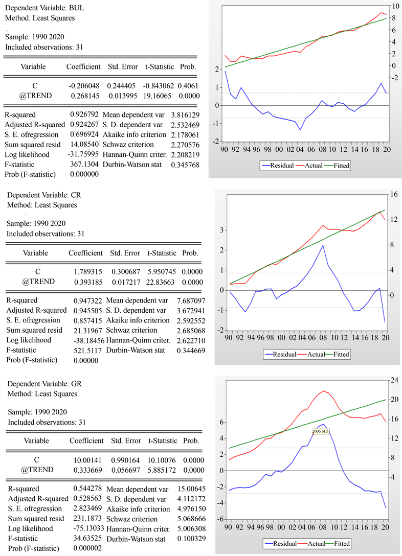 In the following diagram, the linear trend model and trend analysis plot for the examined countries are presented (Figure 2).