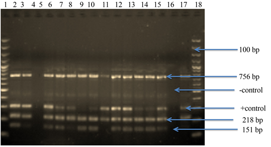 Figure 1. The PCR amplification products of the S. aureus encoding 16S rRNA (756 bp), nuc (218 bp), mecA (310 bp) and the lukS/F-PV (151 bp) genes. Lanes 1 and 18:100 bp molecular weight marker. Lanes 2 - 17 S. aureus isolates.
