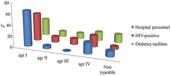 The predominant agr type in all three populations was agr type I, same as results by Meysam et al., 2014 who reported 43.3% for agr type I [40]. In another study conducted by Van Leeuwen et al., 2000, 71% of 192 S. aureus carrier strains were classified as agr I [41]. The role played by agr group I in staphylococcal infections in high risk populations need to be elucidated in future studies.