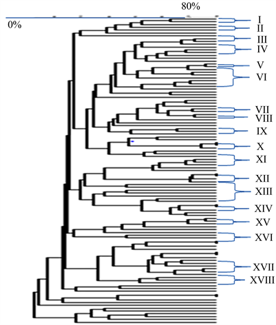 Of the 95 (35 MRSA and 60 MSSA) isolates that underwent restriction digestion with Sma1 and electrophoresis on agarose gel, 93 had PFGE detected patterns. Thus 2 MSSA isolates were untypable with Sma1. These two isolates were not analysed any further. Relatedness of strains was analyzed by constructing a dendrogram based on distance value and 80% homology. The dendrogram showed 18 distinct pulsotype designated here as CI to CVIII (Figure 3) and several singletons. Twelve representative isolates based on generated pulsotypes were sequenced using MLST.