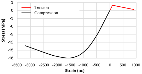 LVL of Paraserianthes falctaria was modeled as an isotropic material with a density of 4 kN/m3, MOE of 7083 MPa, and Poisson’s ratio of 0.3. Meanwhile, the constitutive equation for concrete shown in Figure 5 was used. To model the stress-strain behavior of concrete in compression, Mander constitutive model (1988) was used; the stress-strain behavior of concrete in tension was defined as mentioned in Concrete Manual (2015) [26].