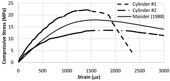 Three concrete compression tests were carried out to evaluate the stress-strain relationship. Three samples were used for this test, with the compression strengths of the concrete cylinders as 17.15 MPa, 22.16 MPa, and 13.72 MPa. Nevertheless, only two stress-strain curves were obtained from these laboratory tests, as shown in Figure 7, because the deformation of the first compression test was not properly recorded.