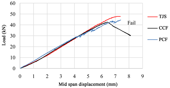 Based on calculation using the g method, the composite action between concrete and OWTJ was found to be low, only 0.032. Almost no composite action was developed by the construction system. In addition, the maximum load capacity obtained from this method was 69.43 kN. Figure 8 shows the load-displacement curve of the composite floor obtained from the four-point bending tests. The OWTJ (TJS), composite floor (CCF), and PCF tended to have similar stiffness values and load-bearing capacities. As presented in Table 2, the maximum loads that could be supported by the TJS, CCF, and PCF specimens were 47.78 kN, 42.29 kN, and 44.51 kN, respectively. When this maximum load is divided by the area of the floor, the ultimate bearing capacities of TJS, CCF, and PCF are obtained as 22.75 kN/m2, 20.14 kN/m2, and 21.19 kN/m2, respectively. The ultimate bearing strength of TJS was 12.96% and 7.36% higher than