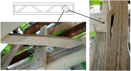 After the CCF specimen reached its ultimate bearing strength, the diagonal members of OWTJ near the support experienced lateral buckling, resulting in delamination on the LVL member, as shown in Figure 10. In this condition, the capacity of the structure decreased as the displacement increased. The concrete slab did not show damaged when the test was terminated.