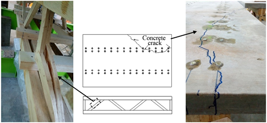 The experimental result did not provide any specific pattern of composite floor failure. However, one of the diagonal OWTJ members located near the supports of the CCF and PCF specimens experienced buckling failure, followed by delamination in the LVL member; moreover, the concrete near the shear connectors in the PCF specimens cracked. Predrilling holes in the construction caused some micro-cracks near the holes. This initiated the occurrence of a greater crack in the concrete slab in the PCF specimen, as shown in Figure 11. For further application, predrilling holes in the concrete slab is not recommended. The use of removable steel pipes to create holes during the concreting work is suggested in order to avoid the existence of micro-cracks near the holes.