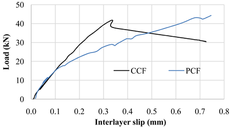 OWTJ specimen is shown in Figure 12. Comparing the interlayer slip values between the CCF and PCF specimens, the slips were almost the same at the initial stage of the loading. The epoxy resin that was used to remove the hole clearance the lag screws installation maintained a good bond with the concrete slab. As a result, the structural performance of PCF was similar to that of CCF both in terms of initial stiffness, interlayer slip, and ultimate strength. However, after the load reached 15 kN, the interlayer slip on the PCF specimen became greater than that on the CCF specimen.
