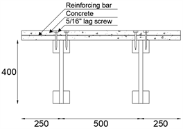 As shown in Figure 2, the specimens for TJS consisted of two OWTJs, to resist the load, while the test specimens for CCF and PCF consisted of two OWTJs and a 60 mm-thick concrete slab with a design compressive strength of 15 MPa at the top. The concrete slab and OWTJ were connected using 5”-5/16 lag screw with a bending yield strength (Fyb) of 568 MPa, as performed in a previous study [22]. The lag screws were inserted perpendicular to the LVL grain. For the PCF specimens, the concrete slab was connected to the OWTJ after 28 days of curing. Lead-holes of 10 mm in diameter were made, and the lag screw was fastened through these holes. To fill the gap between the screw and the hole, the epoxy resin Sikadur 52ID was injected after the lag screws installation.