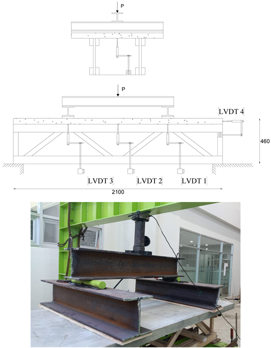 The composite floor was examined in a four-point bending test, as presented in Figure 3. The load was applied using a 100 kN hydraulic jack. The load was distributed using steel beams located above the composite floor. Three linear variable displacement transducers (LVDTs), one at mid-span and the other two at loading points set at 550 mm from the supports, measured the vertical displacement during the test. The interlayer slips between the concrete slab and OWTJ were also measured using LVDT 4. Each LVDT had a measurement length of up to 50 mm with an accuracy of 0.01 mm.