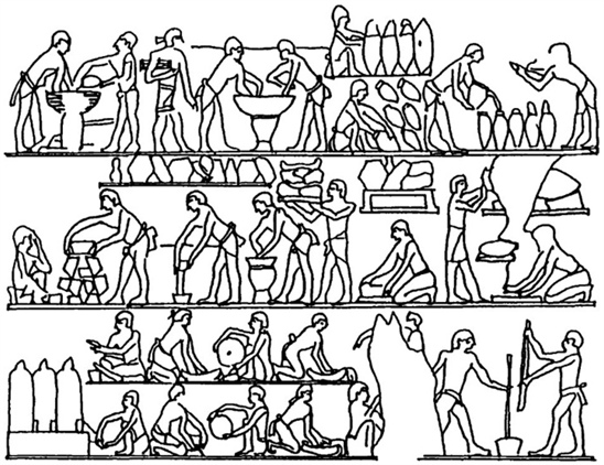 Figure 11. Relief from the Third Dynasty (2686-2613 BC) tomb of Ti at Saqqara depicting the beer-making process (Geller, 1992) . Process is shown in sequence from bottom left to top right, from measurement of grain to filling and sealing jars of sieved beer. The scene in the middle of the top row would be mashing by bare hands.