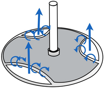 Figure 14. Flow around the disc with three holes, causing vortices or bubbles (described as small round arrows) at the sharp edges.