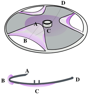 Figure 3. Tri-Lobed Disc illustrated (top), with its vertical cross section along ABCD (bottom).