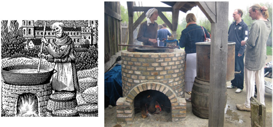 Figure 23. Medieval way of Mashing (Dineley, 2009). Brewers demonstrating medieval mashing techniques, as shown in the woodcut (left) of Monk brewing, at Eindhoven Open Air Museum, April 2009.