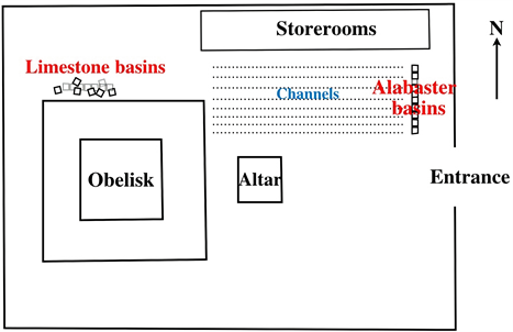 Anyway, the presence of so many large basins indicates that the sun temple was so dignified and distinguished to perform big religious celebrations to consume beer in great quantities, so that the storerooms (or “storage magazines”) adjacent to the alabaster basins, located to the right of the entrance of the temple Figure 25, were always filled with lots of the main offering material, i.e., beer jars.