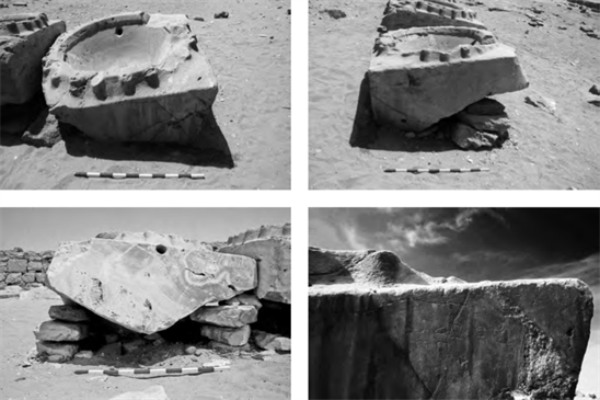 Figure 27. Detailed view of one of the alabaster basins at Nyuserre’s Sun Temple. Seen from the eastern (top left), northern (top right) and western (bottom left) side, with detail of the inscription (bottom right). The basin has a horizontal hole or duct in its upper part, and rests on stones, not directly on the pavement (photos by M. Nuzzolo, (Nuzzolo, 2016)).