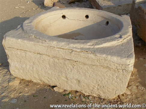 Figure 28. Limestone basin with three rounded holes or ducts, at Nyuserre’s Sun Temple (https://www.revelations-of-the-ancient-world.com/the-tanks-of-abu-ghorab/).