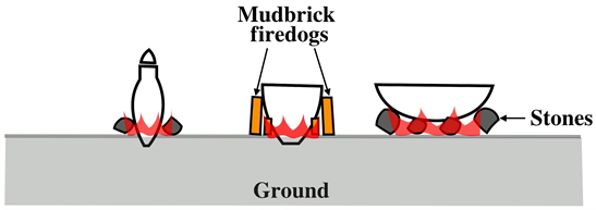 Figure 29. Various ways of heating, according to the shape of container: A jar with pointed base (left), a truncated conical bowl like the inner one of any vat in Figure 8 or Figure 10 (middle), and a bowl like the inner one of the basin in Figure 26 or Figure 28.