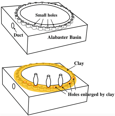 As mentioned before, the limestone basins have no small holes on their rims, and we have wondered what caused the difference of shape between the alabaster basin and the limestone one. As a feasible reason, we suspect either of the following: