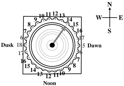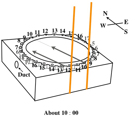 . Recall that the number “13” was a preferable number for ancient Egyptians who believed that there were 12 stages to this life and the 13th was the ascension to an eternal afterlife. We believe the rim of the basin was used as a sundial. Though, of course, the obelisk stood high in the Court was surely used as a sundial, it would be very convenient if the basin itself could be used as a timekeeper. Let us explain how the basin can be a sundial. There would be three candidates for “gnomon” as in Figure 33: Vertical pole of a mash rake, beer jars on the rim of the basin, or verical poles touching the side face of the basin. Note that the mash rake here should be one with a slightly rounded bottom which fits well to the bottom of the inner bowl of the basin (as illustrated in Figure 33); then, the pole of the mash rake, placed at the center of the basin, will naturally stand vertical. Such a vertical pole can be the gnomon of the sundial as shown in Figure 33, Figure 34. An alternative way to make the basin into a sundial is to utilize the beer jars erected vertically on the rim of the basin as in Figure 30. They will make parallel shadows. Choose one of such shadows which directs to the center of the basin. Then, this shadow tells the
