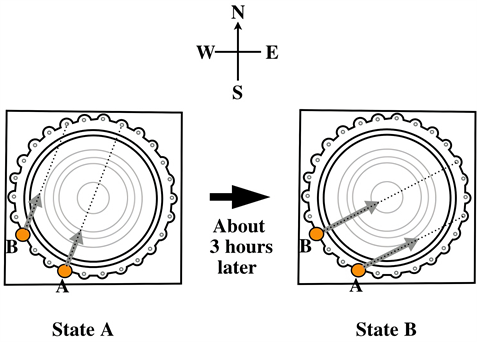 Figure 35. In State A (resp. B) the shadow of the jar A (resp. B) directs to the center of the basin. Passage of time from State A to State B can be read as about 3 hours by counting the 3 intervals between A and B.