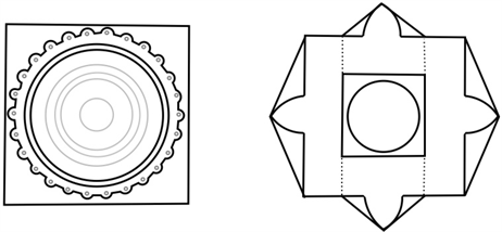 Figure 37. Top view of the alabaster basin (left) and the altar, both symbolizing the sun with the corona. Their common feature is “a disc in a square with flares.”