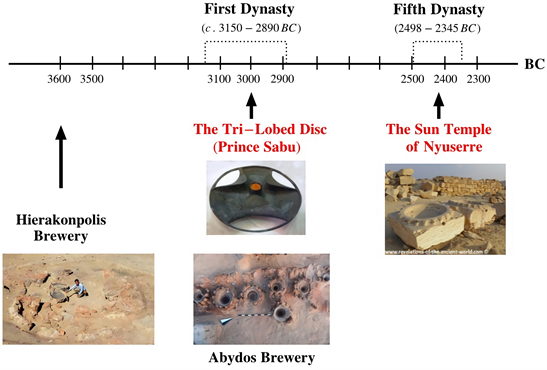 As a by-product of this research, we also uncovered or reinterpretated the role of the basins at the sun temple as mash tuns for ritual beer brewing. The authors of (Dineley & Dineley, 2013), one of whom is a craft brewer, assert that “the brewer requires a good floor to accommodate sticky and messy spillages, paving would be ideal and good drains are essential.” The sun temple well satisfies these conditions as described in (Nuzzolo, 2016) that: The area of the so-called “big slaughterhouse,” located in the north-eastern sector of the sun temple, is characterized by a limestone pavement inset with channels, each 24 cm wide. Note also the report in (Arias, 2020) that “A large amount of ceramic finds (most of which belong to the Fifth Dynasty) came from the cleaning of the area of the alabaster basins. … Among the contexts, jars were the most frequent class, with a clear predominance of beer jars in both diagnostic and non-diagnostic sherds, followed by the class of bread forms in diverse types.” While looking around the area of the limestone basins, Brien Foerster pointed out in his video (2017) (https://www.megalithicbuilders.com/africa/egypt/lower-egypt/abu-gorab-sun-temples) that “some of the stones appear to have scorch or heat marks.” This observation surely supports our idea that the basins were heated for brewing. Thus, we want to conclude this article with our hope that, in near future, any brewing residues on and around the basins would be detected further to be examined chemically, in order to confirm our view, together with scorch on the basins as an evidence of heated mashing. As mentioned at the end of Section 1, we insist that the importance of ritual brewing should be taken seriously in the history of ancient Egypt, in particular in the third and fourth millennia BC. A bit amazingly, this is true even outside of Egypt: (Dineley, 1997) claims about the Neolithic culture around Orkney, Scotland, that “Ritual brewing may have been one of the main activities that took place at sacred Neolithic ceremonies in the 3rd millennium BC.”