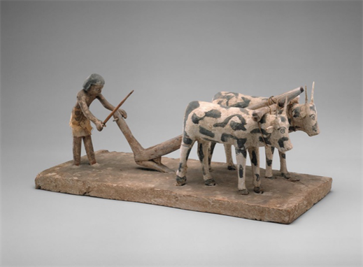 Figure 5. Model of a man plowing using the hook-shaped plow pulled by two oxen, Middle Kingdom (The MET, https://www.metmuseum.org/art/collection/search/544255).