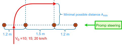 Prompt steering evaluates the ability of sharp turns. Driving in city centres often requires short turns due to narrow streets or avoiding obstacles. The driver drives through two pylons at a constant velocity. The driver has to turn as short as possible and the distance required to make a 90˚ turn is measured as seen in Figure 9.