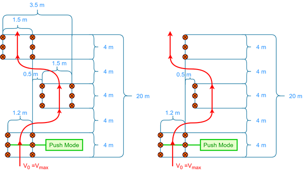 A double lane change and a slalom require quick changes and proper control of the vehicle. The double lane change examines the highest possible speed for the vehicle driving through the obstacle. The maximum mean velocity of the course is measured. An adaptation was made in the manoeuvre to account for wider vehicles as seen in Figure 10.