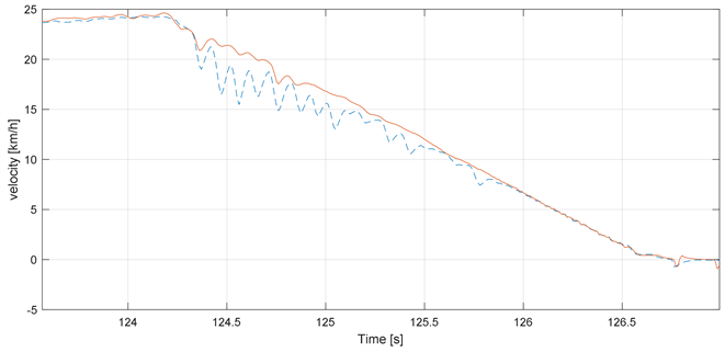 The µ-split brake of the LMV had distortions below 10 cm which indicates that the LMV remains stable during braking. No data was available of the other multitrack vehicles. The integrated ABS individually interrupts the regenerative braking when a wheel starts slipping as can be seen in Figure 13. The wheel on the lower friction surface has more fluctuations in the wheel velocity. This prevents the wheels from slipping and improves control during braking. The µ-split braking test had on average a 10% longer braking distance compared to the standard braking test.