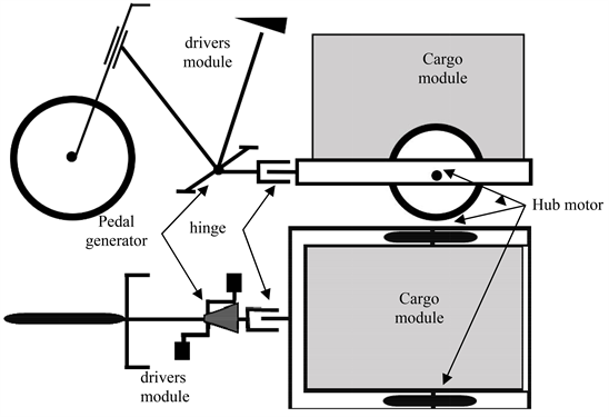 The flexible construction between the modules prevents a traditional bicycle drive train. Tilting would misalign the chain and cause a derailment. Another flexible mechanical coupling is an alternative that would make it more complex, expensive and would require a higher wheel dropout. An electrical drivetrain doesn’t require extra installation room and has fewer design constraints.