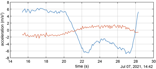 No results were available for the benchmark vehicles. The LMV has a mean maximum velocity of 12.8 km/h. The respective lateral acceleration is 1 m/s2. Switching direction causes a lower maximum speed compared to the steady-state turn. The lateral acceleration of the driver during the eight is higher (Figure 18). This may be because the driver leans less due to the changing turns. The maximum acceleration of the cargo is similar to the steady-state turn.