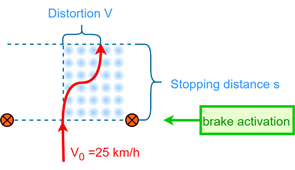 The braking test is expanded upon for multitrack vehicles by braking on different friction surfaces. This test is done at a velocity of 25 km/h. The previously mentioned paper tests the braking on ice, but this is too difficult to set up. The braking test will be performed on the pavement on one side. The other side is driven on loose gravel, steel sheets, polished concrete or low friction tape around one tire to obtain a friction coefficient below 0.15 [20]. The difference in friction will cause a different braking reaction on the left and right wheels. Distortion after braking is measured to examine the stability of the vehicle during an emergency brake as seen in Figure 6.
