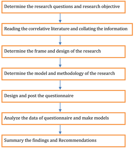 To achieve the aim of this research, the researcher had to follow the steps accordingly. Firstly, it should determine the research questions and research objective after analyzing the theoretical and realistic research background. Secondly, it should collate the correlative review of related studies, literature, and information. Thirdly, it should ensure the frame and the design of the research. Fourthly, it should determine the model and methodology of the research. Fifthly, it should design and post the questionnaire about the research object. Sixthly, it should analyze the data of the questionnaire and make models using the collected data of the case study. The models include principal component analysis and multiple linear regression models. Lastly, it should summarize the findings and recommendations of this research study (Figure 2).